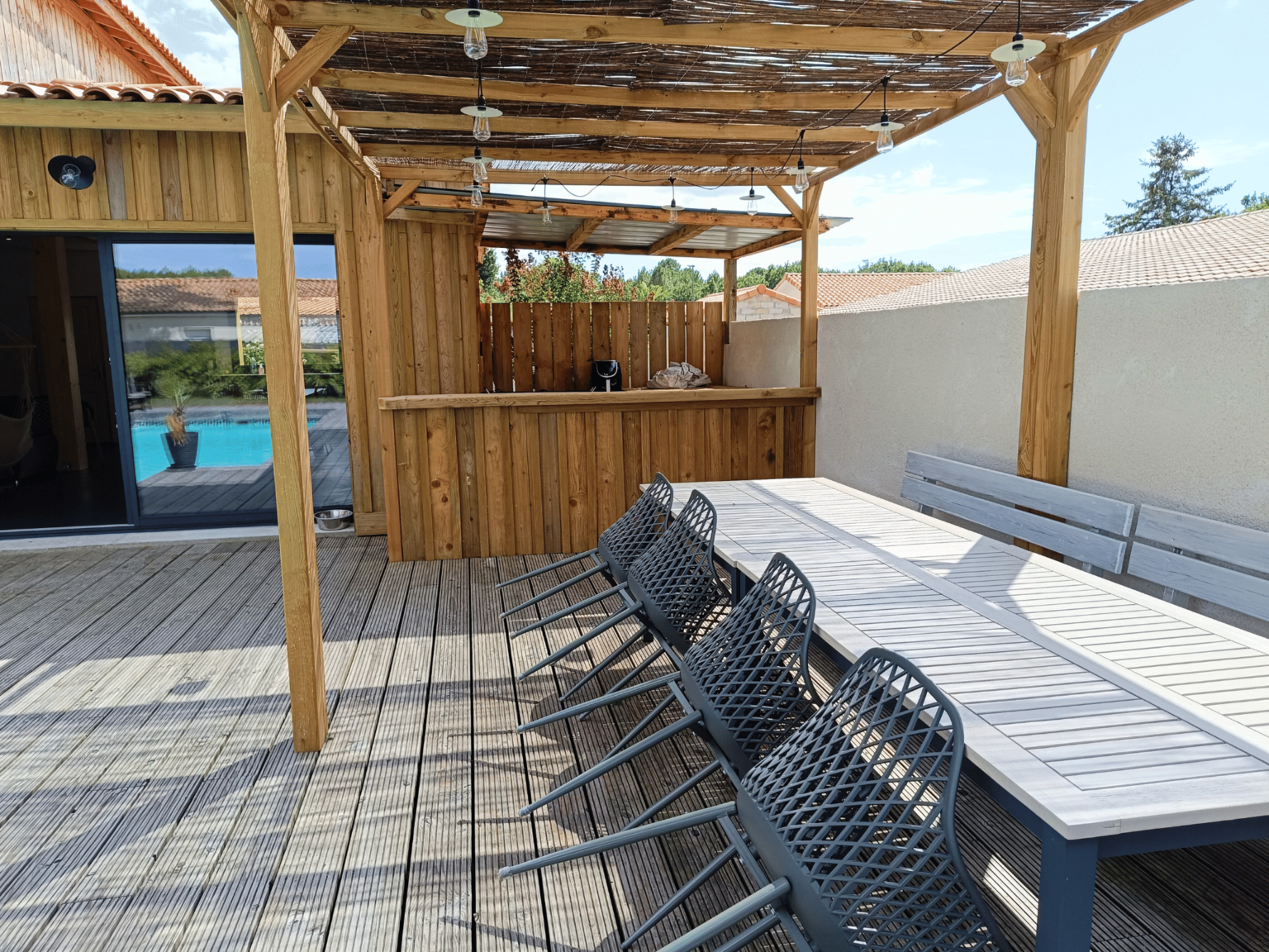 La Villa de Louis dispose d’une terrasse de plus de 110m² en bois local (pin maritime), sans vis-à-vis, pour profiter du soleil en toute intimité.
